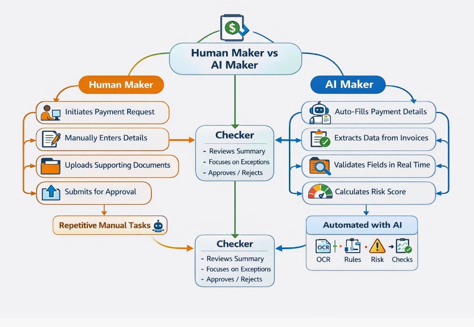 Now, imagine the Maker being AI, and the Checker remaining human. This isn't just a futuristic concept; it's becoming a regulatory and operational necessity, especially in high-stakes  areas like AML, KYC, Payment Transactions, and Tax where precision and compliance are paramount. As organizations navigate complex,